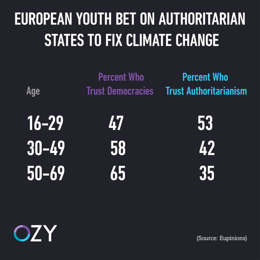 A majority of Europeans in the 16-29 age group believe authoritarian states have a better shot at addressing the climate crisis than democracies, according to a recent Oxford-backed survey. The findings are the latest hit to the credibility of democracy in a Europe that is already witnessing the rise of populists, Ozy reports.