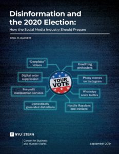 Tech firms’ policies need to change to prepare for escalating disinformation threats ahead of the next election, said Paul M. Barrett, the NYU professor who wrote the report, Disinformation and the 2020 Election: How the Social Media Industry Should Prepare. Social media firms have to do everything they’ve been doing and more to prepare for the ever-changing threat, he told The Post’s Cat Zakrzewski, proposing nine recommendations for how companies should get ready for disinformation in 2020: