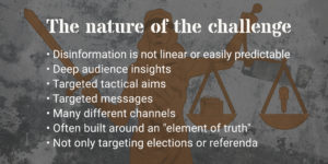The disinformation campaign has different levels of ambition. The objective in 2014 was to help Russia achieve its military goals in Crimea. European elections and referenda were targeted in 2016 and 2017 in order to weaken consensus within Europe on the policy towards Russia. But it is not only about targeting elections or referenda. …. …. RTWT