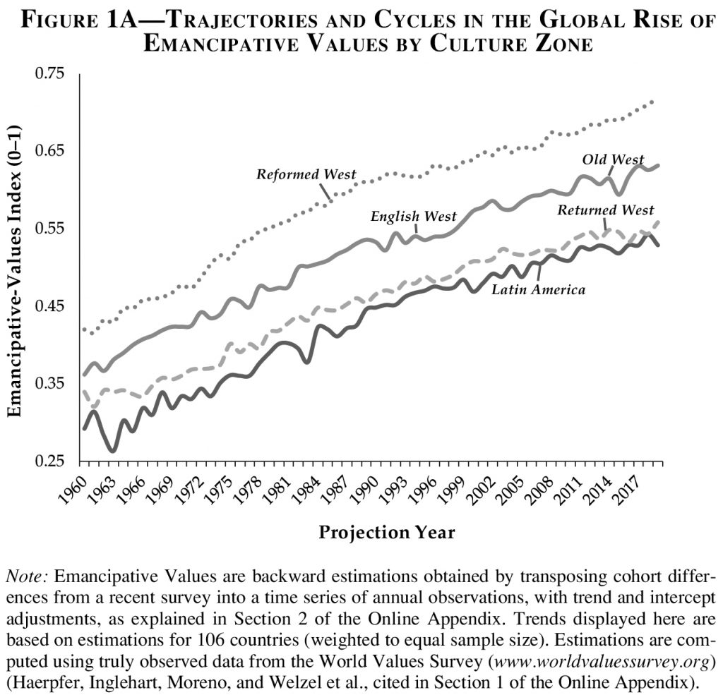 Across the globe, existential opportunities, emancipative values, and liberal democracy have been rising in astonishing unison, promoting a more encompassing trend toward “human empowerment,” adds Christian Welzel, the former president of the World Values Survey Association. Consequently, emancipative values are spreading beyond the borders of Western culture and ascending through generational replacement across all the globe’s culture zones, he writes for the Journal of Democracy.
