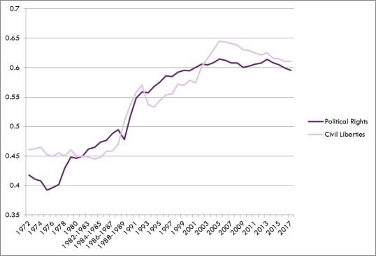 democratic decline Freedom in the World’s Political Rights and Civil Liberties Ratings Since 1972 Next → emailTwitterFacebookTumblrLinkedinPrint